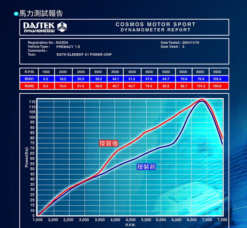 Sixth Element products had under various performance tests. It clearly demonstrated improved torque output, better fuel consumption efficiency and increase of engine power. The ignition system is more stable and quicker response when accelerating. The brightness of headlight also increased. The test report as follow: